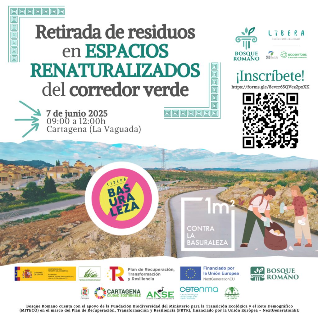 En el marco de la iniciativa anual «1m2 contra la basuraleza» del Proyecto LIBERA, ANSE realizará una limpieza de residuos junto al nuevo trazado peatonal del corredor verde de Bosque Romano, zona donde la asociación también está llevando a cabo trabajos de renaturalización urbana junto al Ayuntamiento de Cartagena, ARBA y CETENMA.