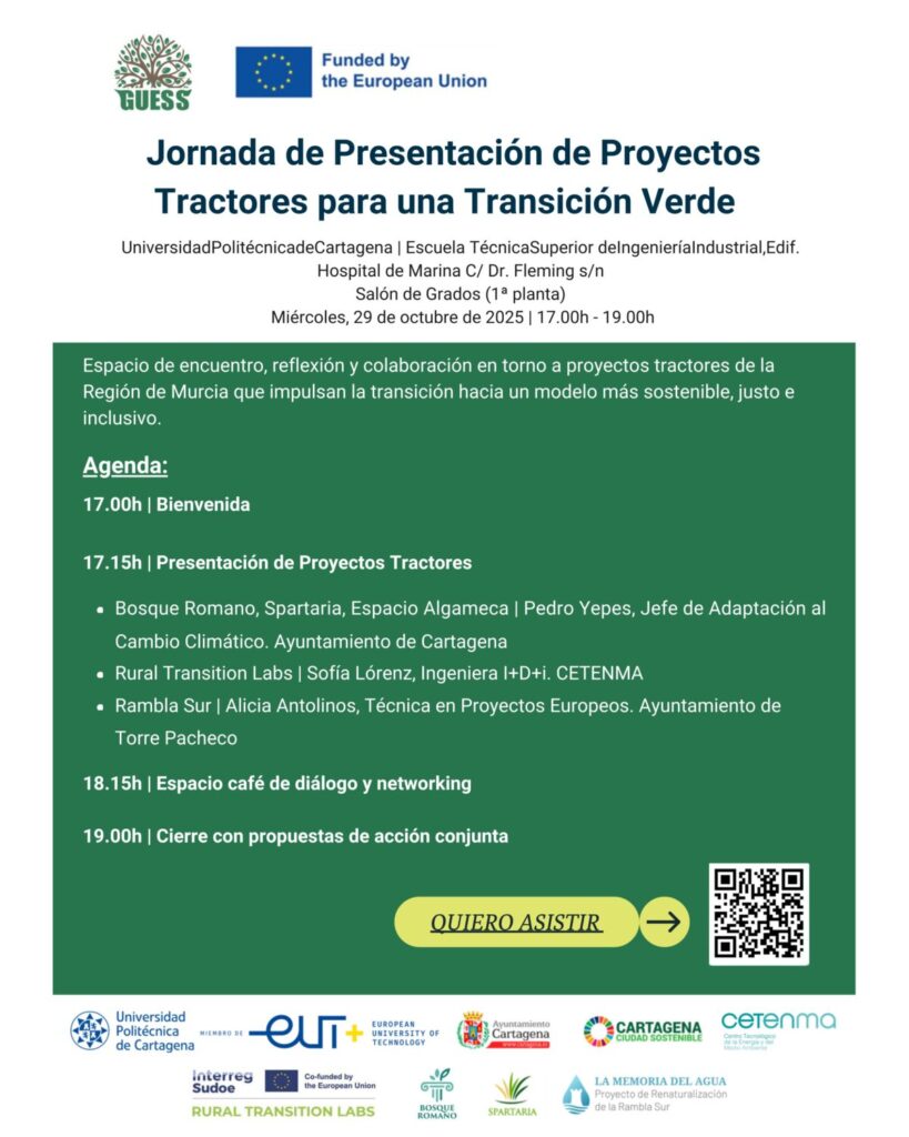 Además, se compartirán experiencias de proyectos clave en la Región de Murcia, como Bosque Romano, Spartaria, Espacio Algameca, Rural Transition Labs y Rambla Sur. Generando un espacio de encuentro, reflexión y colaboración en torno a estos proyectos que impulsan la transición hacia un modelo más sostenible, justo e inclusivo.