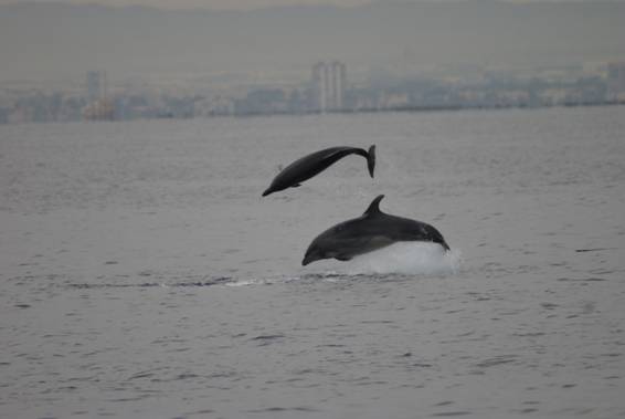 Foto 2. Un adulto y una cría de Delfín mular saltan al unísono durante un avistamiento. Al fondo, las encañizadas de San Pedro del Pinatar (José Luis Murcia/ANSE).