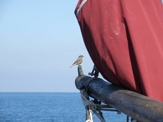 Foto 3. Colirrojo tizón descansa en el bauprés del Else, cogiendo fuerzas para continuar con su viaje migratorio. (José Luis Murcia/ANSE).
