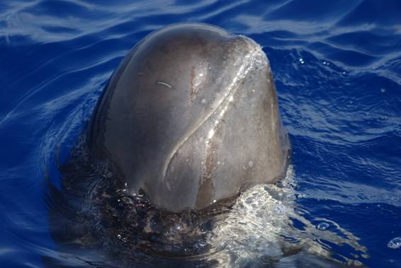 Imagen 1. Ejemplar de Calderón común realizando una salida del agua casi vertical para observar a su alrededor, en un comportamiento conocido como «espiar» o «Spying» (© José Luis Murcia/ANSE)