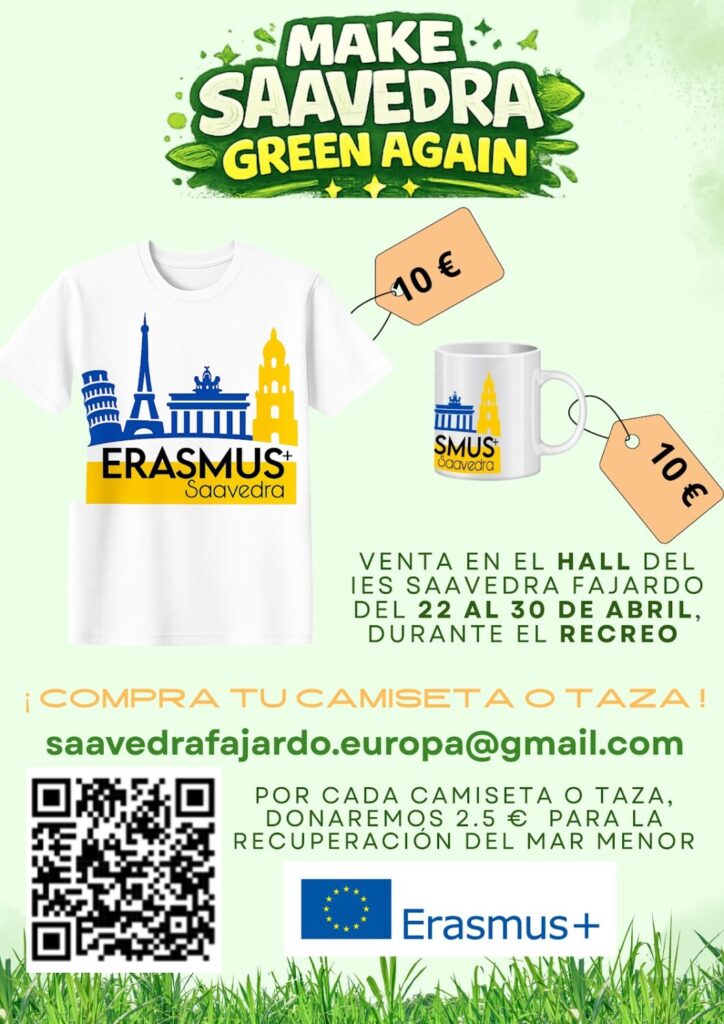 Dentro de esta línea de trabajo nace la campaña “Make Saavedra Green Again”, una iniciativa solidaria que une participación educativa y acción ambiental. A través de la adquisición de camisetas y tazas Erasmus, la comunidad educativa contribuye directamente a la conservación del entorno natural.