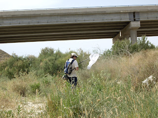 Un voluntario captura odonatos en puntos de agua cercanos al humedal de las Moreras, donde se pudo localizar un ejemplar de Coenagrium coerulescens, un iberoafricanismo catalogado como vulnerable en el libro rojo de invertebrados de Andalucía.
