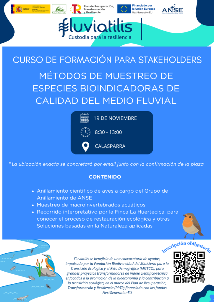 El próximo miércoles, 19 de noviembre, se celebrará la tercera edición del curso dirigido a stakeholders en el marco del proyecto Fluviatilis. El curso tendrá lugar de 8:30 a 13:00 horas en la finca de la Huertecica (Calasparra/Moratalla), bajo el título: “Métodos de muestreo de especies bioindicadoras de calidad fluvial”.
