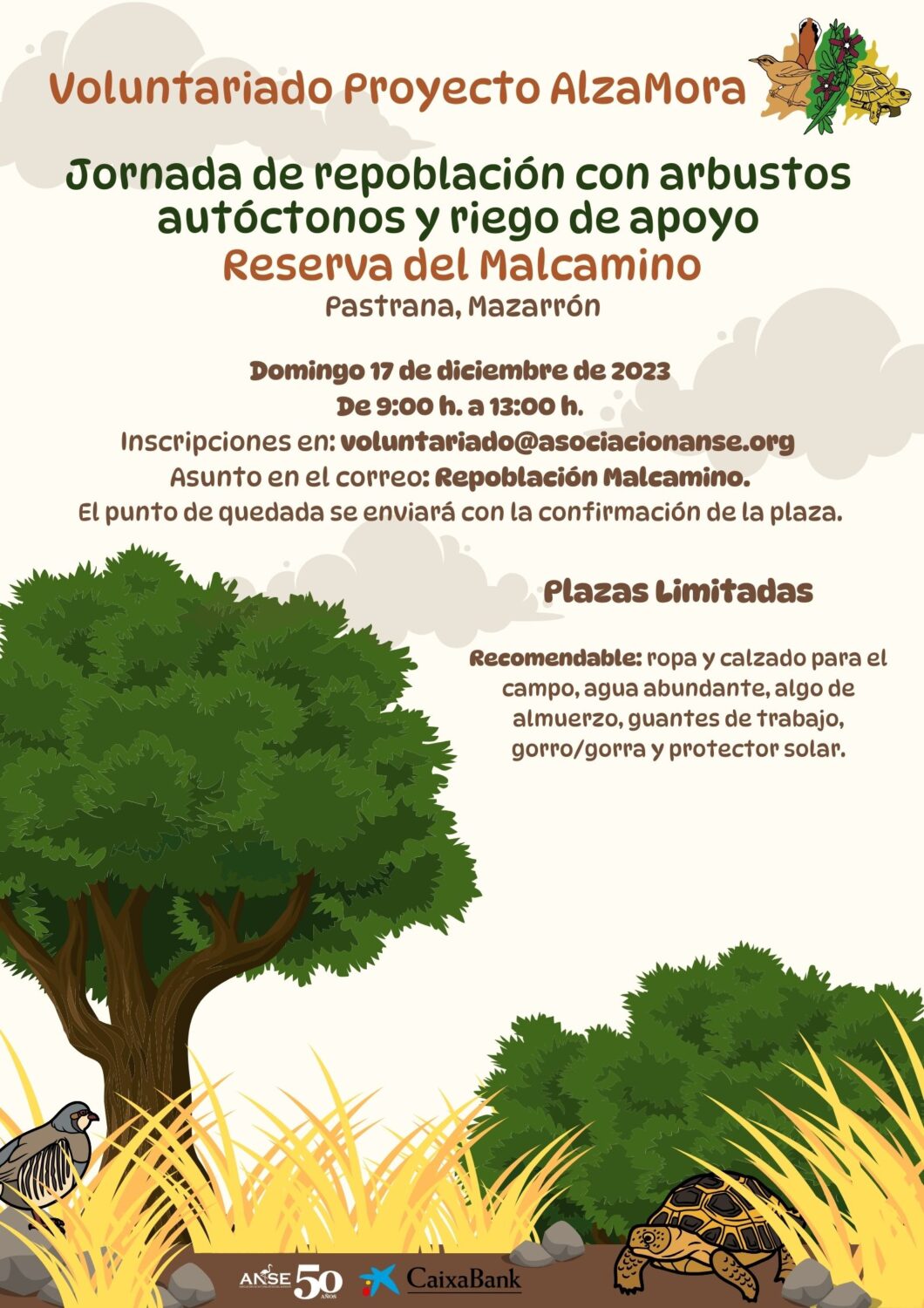 El próximo domingo 17 de diciembre celebramos una nueva jornada de repoblación con arbustos autóctonos en la Reserva de Malcamino. Ayudanos a mejorar el hábitat de la tortuga mora y el alzacola rojizo colaborando con el Proyecto Alzamora.