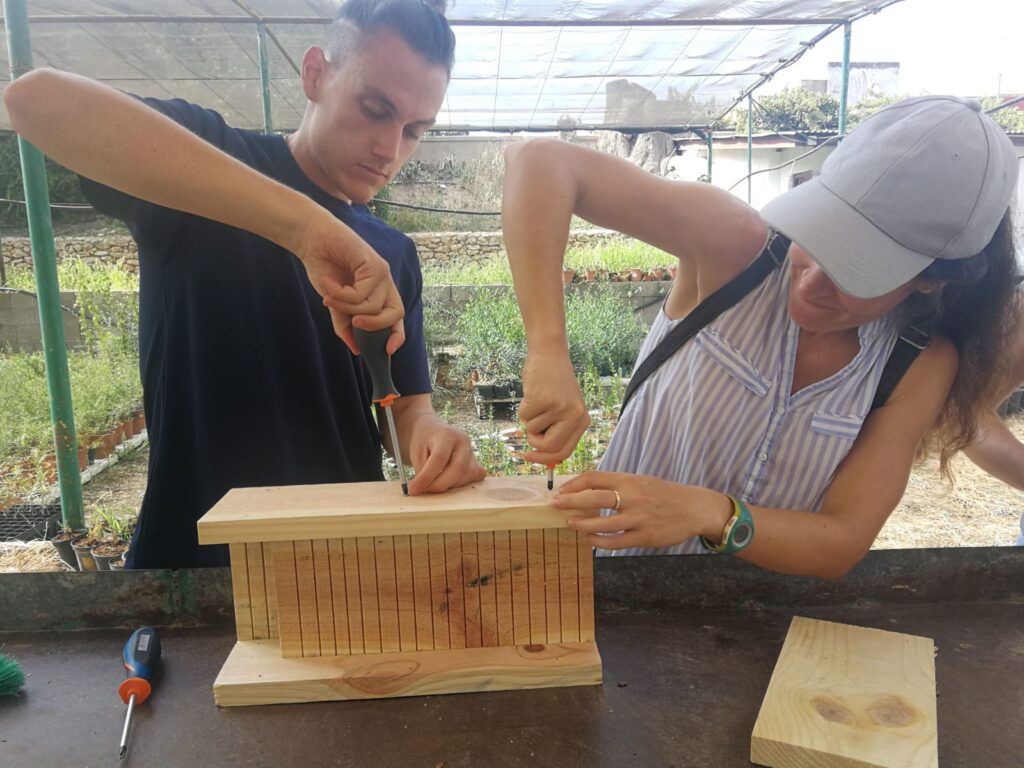 Pero no solo se ha trabajado con flora, también se realizó una jornada de montaje de refugios para murciélagos. A lo largo del proyecto se instalarán diversas tipologías de refugios y cajas nido para fauna auxiliar, como diversas especies de aves y murciélagos, grandes consumidoras de insectos, y nidales para abejas solitarias, responsables en gran medida de procesos como la polinización, fomentando su presencia en las áreas verdes y periurbanas donde se está actuando.