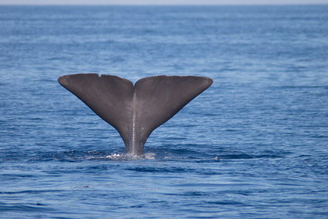 Tras apenas una hora de navegación, al sur de Cabo de Palos y en unos 400 metros de profundidad, se avistó un cachalote (Physeter macrocephalus), de una longitud de 8 a 9 metros. Durante una hora se permaneció en sus proximidades con el ánimo de esperar al momento de la inmersión, ya que es entonces cuando muestra la aleta caudal y se puede fotografiar.